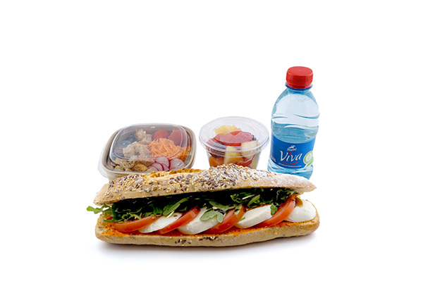 CompositionLe Provençale Tomate Mozza : 1/2 baguette céréales, tranches de tomate, mozzarella, tapenade de poivrons, pesto, jeunes pousses de roquette, vinaigre balsamique.