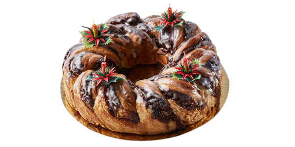 CompositionPâte levée feuilletée, fourrage noisette-cannelle, fondant, nappage abricot, décor plastique non comestible.