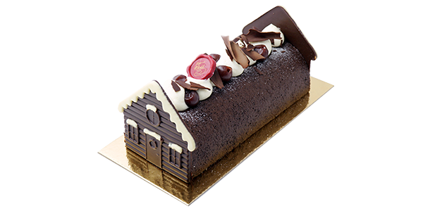 CompositionBiscuit chocolat, sirop Kirsch, crème légère au Kirsch, cerises noires griotte.