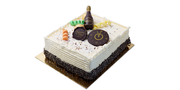 CompositionBiscuit, crème beurre vanille, sirop, vermicelles de chocolat, décor chocolat, cacao, sucre glace.