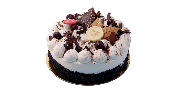 CompositionBiscuit chocolat, sirop Kirsch, crème légère au Kirsch, cerises noires griotte.