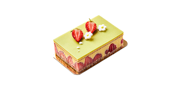 CompositionBiscuit amandes, crème italienne, fraises fraîches, massepain, décor fraises, décor sucre