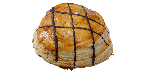 CompositionPâte feuilletée, frangipane au rhum, pépites de chocolat noir, décor chocolat noir.
