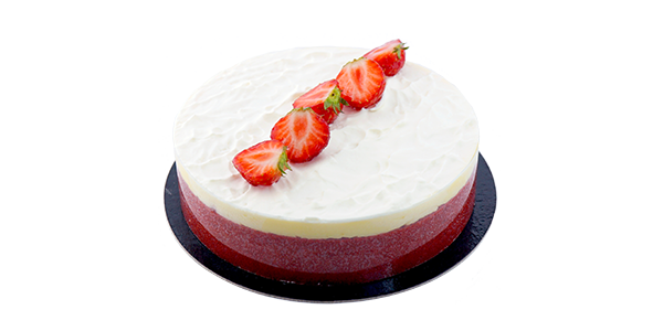 CompositionBiscuit blanc, biscuit joconde, crème italienne, fraises en cube, crème chantilly, décor fraises.