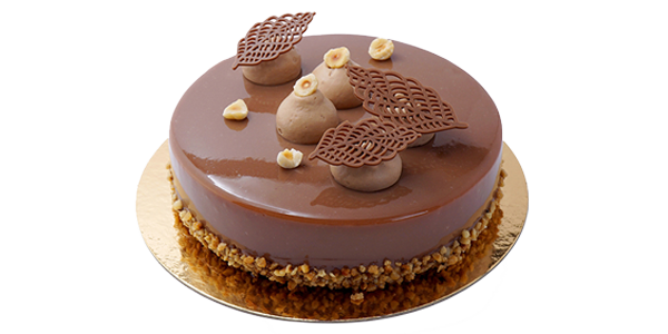 CompositionBiscuit cacao, croustillant praliné, mousse chocolat au lait et noisettes.