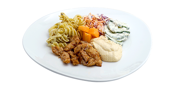 CompositionPoulet rôti, fusili au pesto, coleslaw, houmous, concombre, menthe, melon, assaisonnement