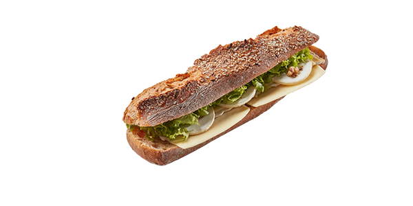 Composition1/2 Baguette Céréales, beurre, brie, chèvre, gouda, cerneaux de noix, salade.