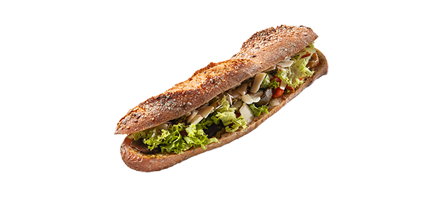Composition1/2 Baguette Céréales, Pesto, légumes à l'huile, salade, crème de balsamique, fromage grana padono, fromage philadelphia, tomate