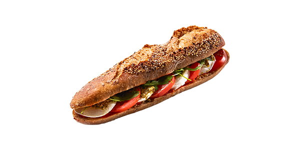 CompositionDemi Baguette céréale, tomate, mozzarella, tapenade aux poivrons, pesto, salade roquette, vinaigre balsamique