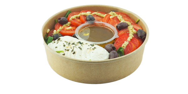 CompositionSalade, tomate, mozzarella, pesto, sauce balsamique.