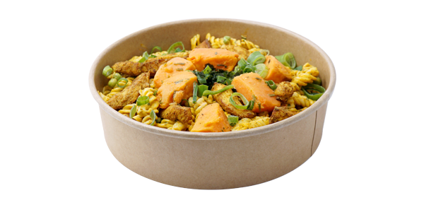 CompositionLët'z Nuddel Fusilli, filets de poulet émincés, sauce curry & coco, patate douce, pois extra fin, poivron rouge, tomate en cubes, oignon botte.