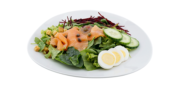 CompositionSaumon fumé, salade verte, concombre, oeuf dur, betterave, citron vert, pousses d'épinard, croûtons, câpres, vinaigrette.