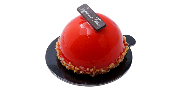 CompositionBiscuit madeleine, mousse framboise, glaçage, amandes hachées.