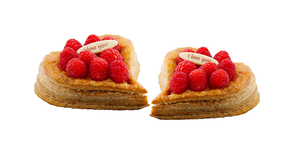 CompositionPâte feuilletée, crème pâtissière vanillée, framboises fraîches.