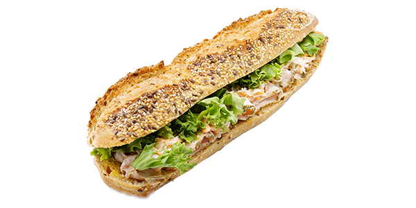 Composition1/2 baguette céréales, sauce rémoulade maison, jambon cuit, jeunes pousses de roquette, tomate