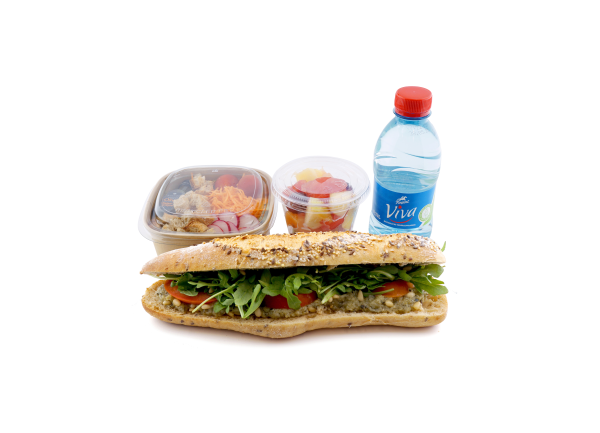 CompositionLe Céréales Courgettes Grillées : 1/2 baguette céréales, tapenade de courgettes, tranches de tomate, jeunes pousses de roquette, pignons de pin.