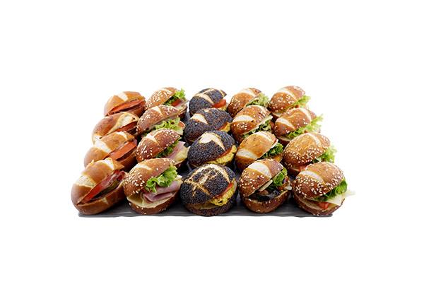 Mini Fromage Tomate Salade : mini pain bretzel, Gouda, jambon cuit, tomate, salade lollo verte.